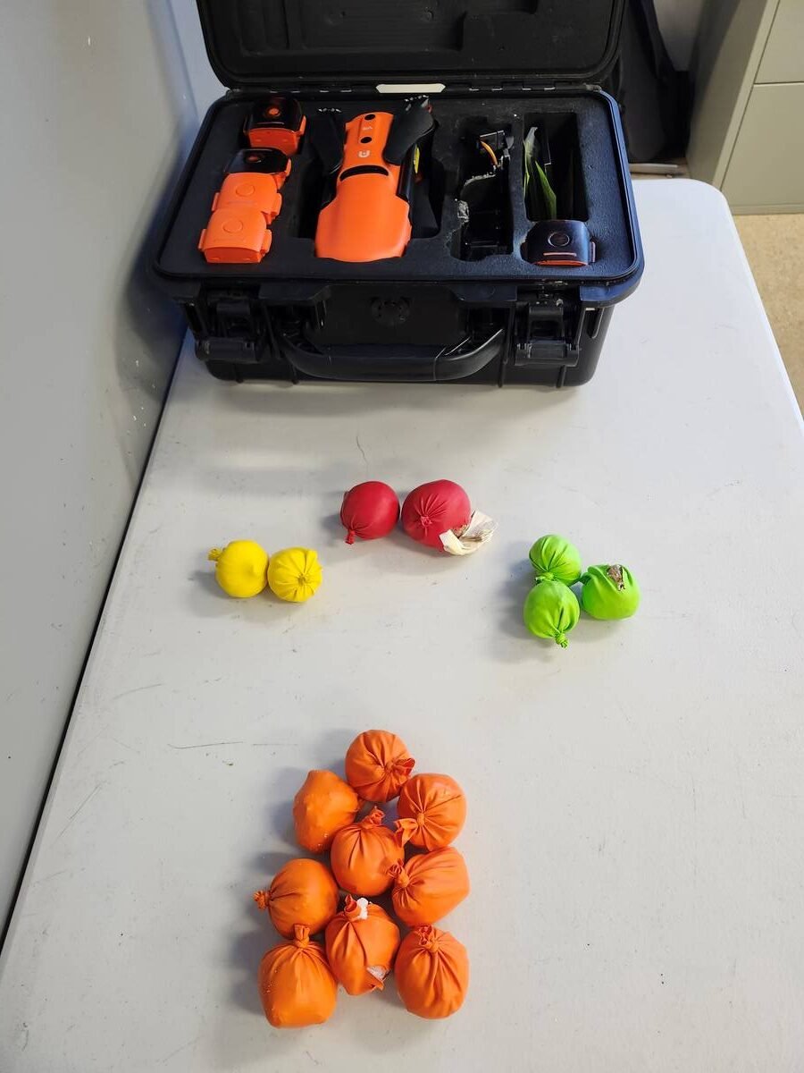Police observed a black hard-shell drone case inside the vehicle. A drone was found sitting at the feet of the male passenger, still rigged with a large delivery package designed to be released remotely. Inside the package, police discovered balloons filled with drugs.